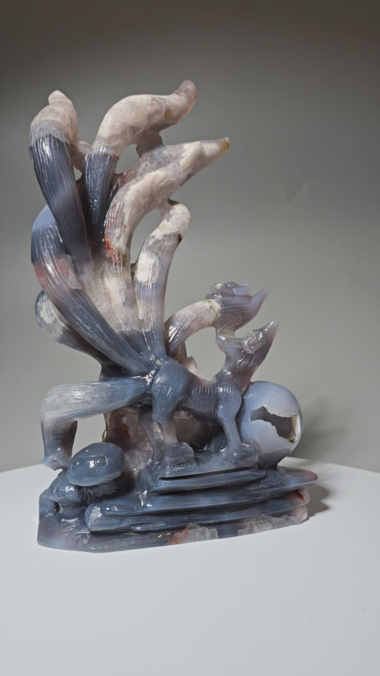 Flower Agate Nine Tail Fox Carving