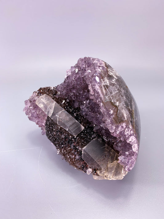 Amethyst natural cluster cut base with clear calcite and Hematite