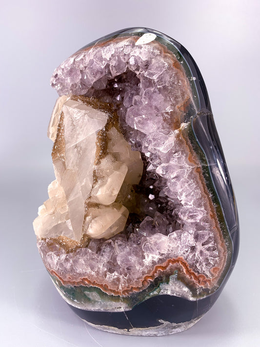 Amethyst natural cluster cut base with calcite and Red/Black Hematite