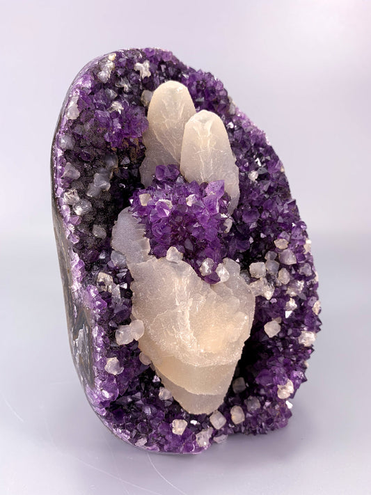 Amethyst natural cluster on stand with calcite