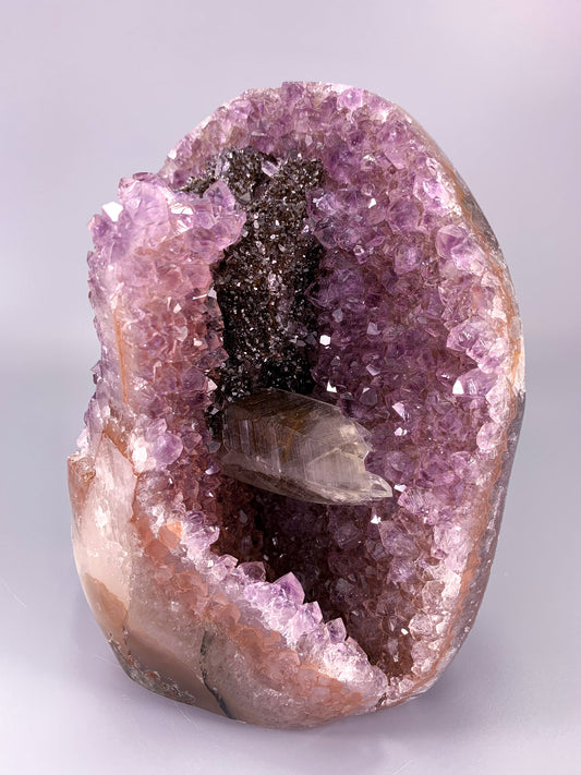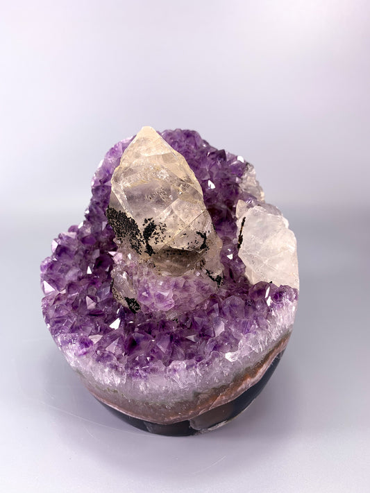 Amethyst natural cluster cut base with clear calcite point and Hematite