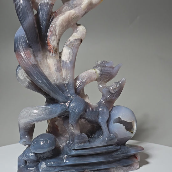 This unique flower agate nine tail fox carving captures the elegance of nature with refined artistry. The delicate floral patterns of the stone beautifully accentuate the intricate tails, symbolizing grace and mystique. A distinguished piece for collectors, it blends natural beauty with timeless craftsmanship.