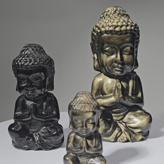 These Gold Sheen Obsidian Buddha's combine exquisite craftsmanship with natural beauty, featuring a lustrous golden shimmer that captivates the eye. This elegant sculpture embodies peace and wisdom. Its smooth, polished surface enhances the depth and glow of the obsidian, offering both visual appeal and a lasting symbol of mindful serenity. Perfect for those seeking a refined statement piece that inspires calm and balance.