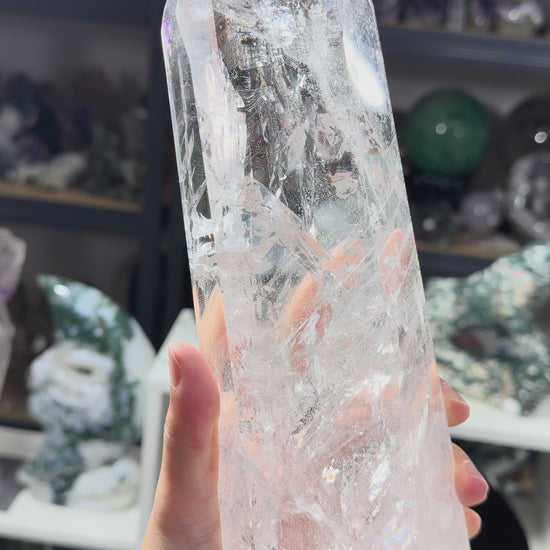 HQ Lemurian clear quartz tower from Brazil. Sourced from Brazil's premier quartz deposits, this tower features exceptional clarity and geometric precision.