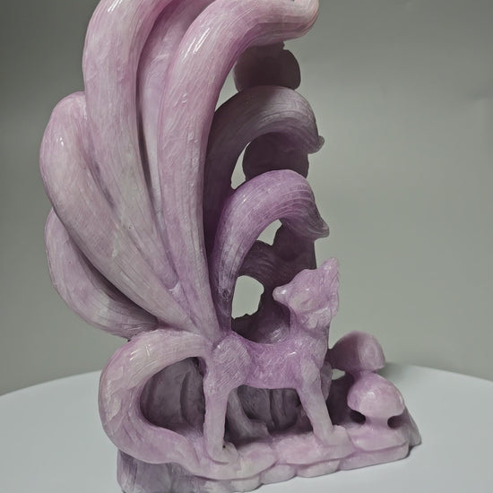 This Kunzite Nine Tail Fox (Kitsune), is a stunning pink gemstone symbolizing elegance and mystique. Its delicate hue and intricate form evoke the legendary Kitsune's grace, making it a captivating addition to any collection. Perfect for those who appreciate refined beauty with a touch of mythical charm.