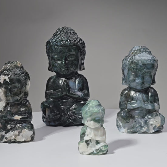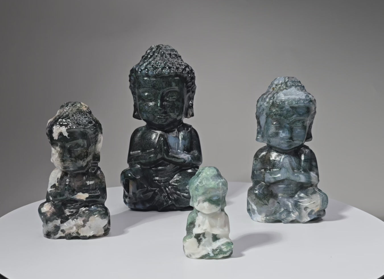 Crafted from exquisite moss agate, these Buddha figurine's embodie tranquility and natural beauty. The intricate patterns evoke a serene connection to nature. Perfect for enhancing mindfulness practices or as a refined decorative piece, the Moss Agate Buddha brings both aesthetic grace and a calming presence to your environment.