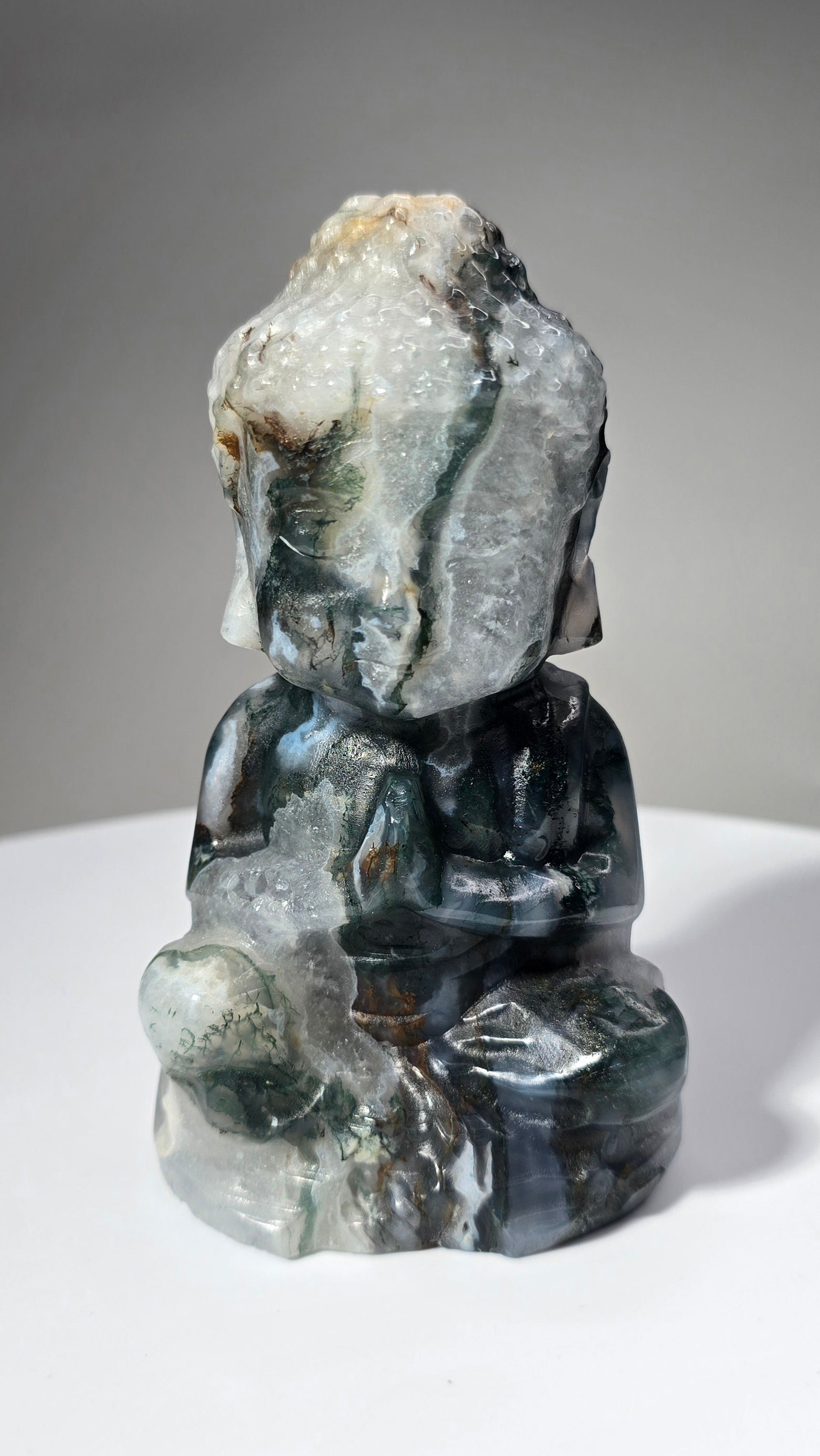 Crafted from exquisite moss agate, these Buddha figurine's embodie tranquility and natural beauty. The intricate patterns evoke a serene connection to nature. Perfect for enhancing mindfulness practices or as a refined decorative piece, the Moss Agate Buddha brings both aesthetic grace and a calming presence to your environment.
