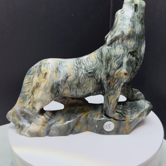 Ocean jasper crystal howling wolf carving with druzy pockets