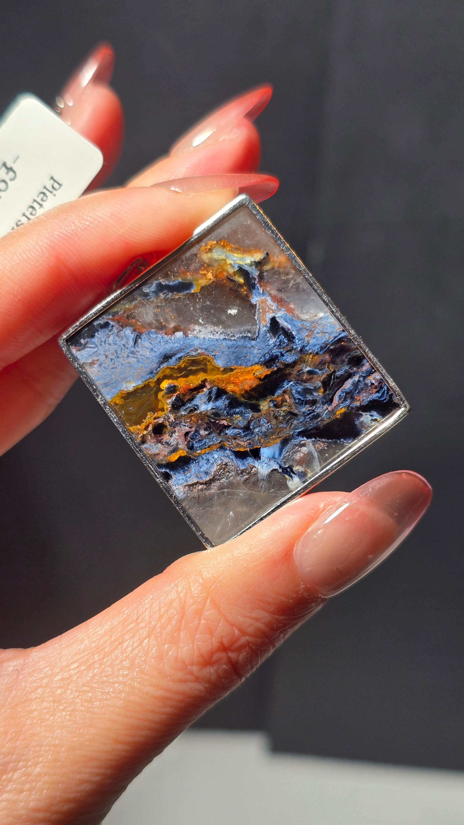 Pietersite Pendant This exquisite pendant pairs the mesmerising beauty of pietersite with sterling silver 925, creating a piece of understated luxury. The stone's swirling bands of sapphire blue, cognac brown, and amber gold are framed by polished silver, enhancing its natural radiance. Pietersite's rare optical properties catch the light with subtle movement, making each glance reveal new depths. A sophisticated accessory for those who appreciate fine minerals and timeless jewellery craftsmanship.
