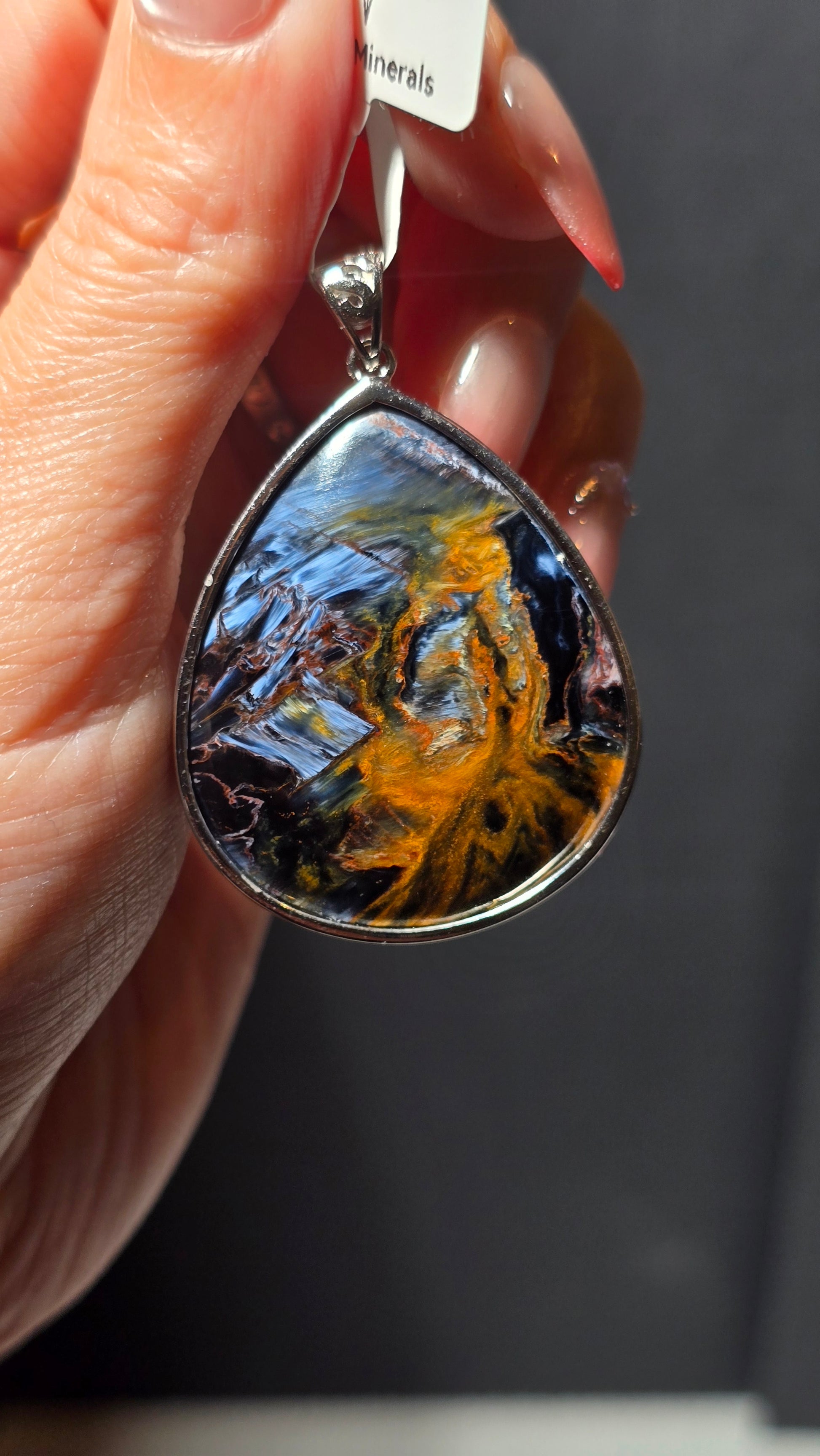 Pietersite Pendant This exquisite pendant pairs the mesmerising beauty of pietersite with sterling silver 925, creating a piece of understated luxury. The stone's swirling bands of sapphire blue, cognac brown, and amber gold are framed by polished silver, enhancing its natural radiance. Pietersite's rare optical properties catch the light with subtle movement, making each glance reveal new depths. A sophisticated accessory for those who appreciate fine minerals and timeless jewellery craftsmanship.