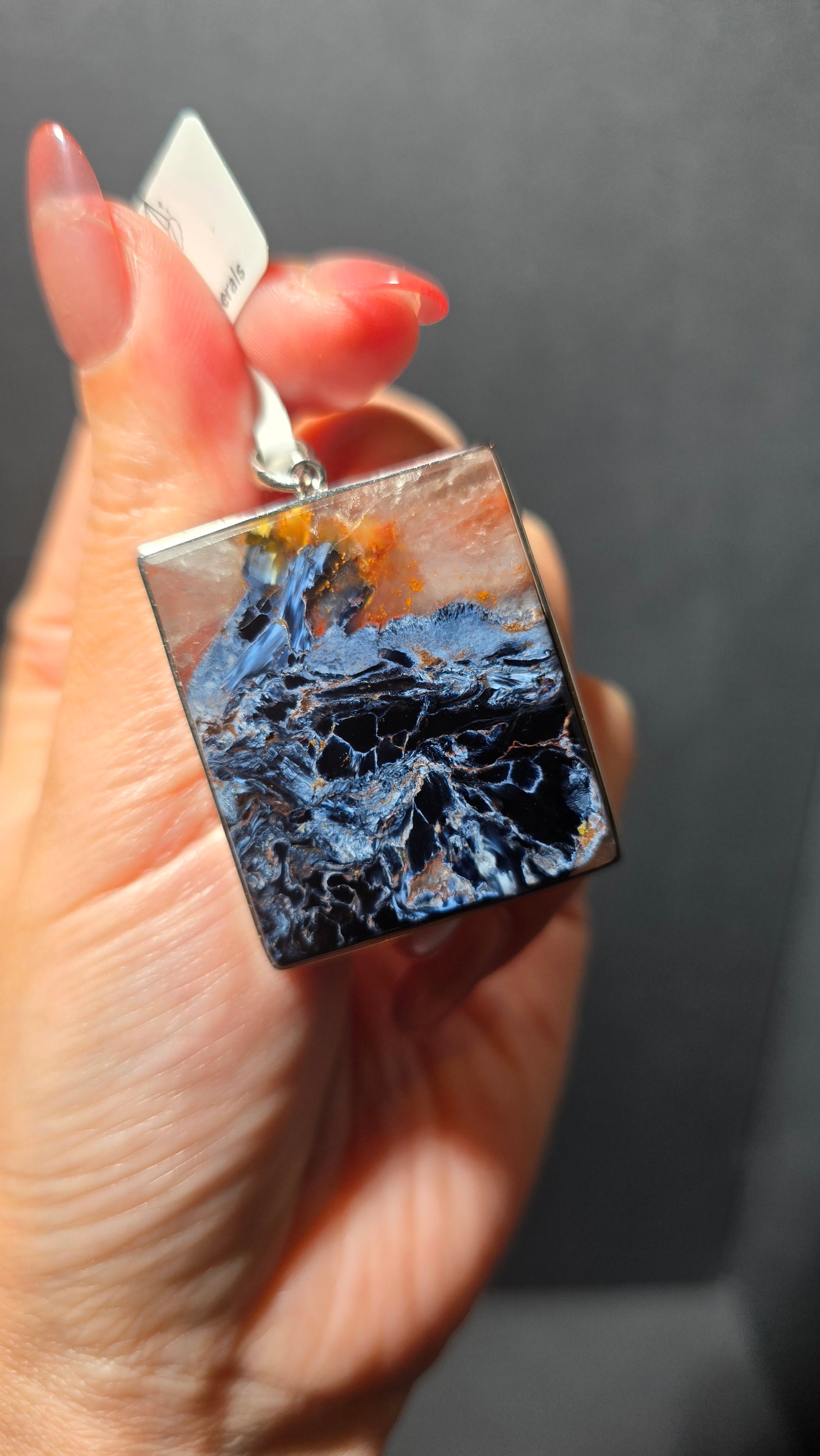 Pietersite Pendant This exquisite pendant pairs the mesmerising beauty of pietersite with sterling silver 925, creating a piece of understated luxury. The stone's swirling bands of sapphire blue, cognac brown, and amber gold are framed by polished silver, enhancing its natural radiance. Pietersite's rare optical properties catch the light with subtle movement, making each glance reveal new depths. A sophisticated accessory for those who appreciate fine minerals and timeless jewellery craftsmanship.