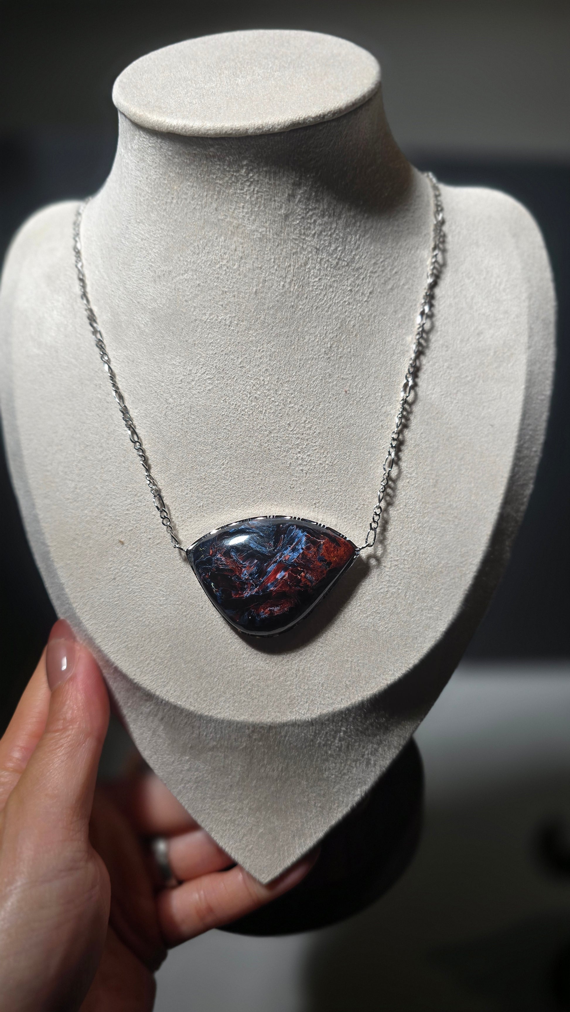 Pietersite Pendant This exquisite pendant pairs the mesmerising beauty of pietersite with sterling silver 925, creating a piece of understated luxury. The stone's swirling bands of sapphire blue, cognac brown, and amber gold are framed by polished silver, enhancing its natural radiance. Pietersite's rare optical properties catch the light with subtle movement, making each glance reveal new depths. A sophisticated accessory for those who appreciate fine minerals and timeless jewellery craftsmanship.