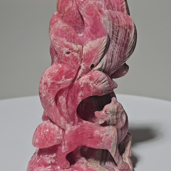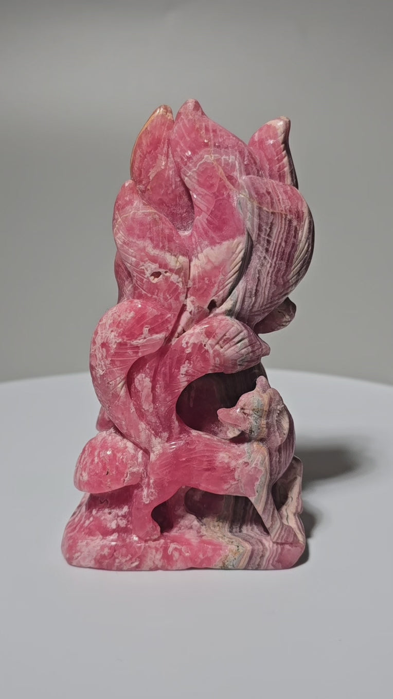 This Rhodochrosite Nine Tail Fox (Kitsune) is a unique, elegantly crafted piece that combines the gentle pink hues of Rhodochrosite with the mystique of the legendary Kitsune. This refined creation captures both beauty and symbolism, offering a sophisticated addition for collectors and enthusiasts seeking a distinctive mineral artwork.
