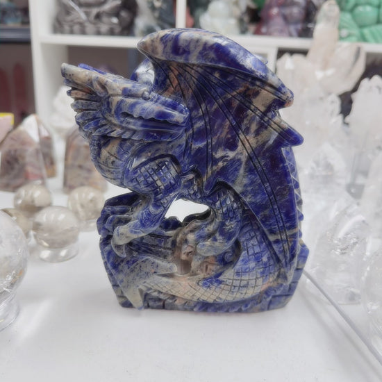 Sodalite hand carved dragon – a striking mineral specimen showcasing the stone's deep blue hues and natural white veining. Each dragon is individually carved by skilled artisans, capturing intricate details in the wings, scales, and facial features.